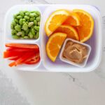Slice an orange and pack the slices in a separate compartment. - Pack the GREEN edamame